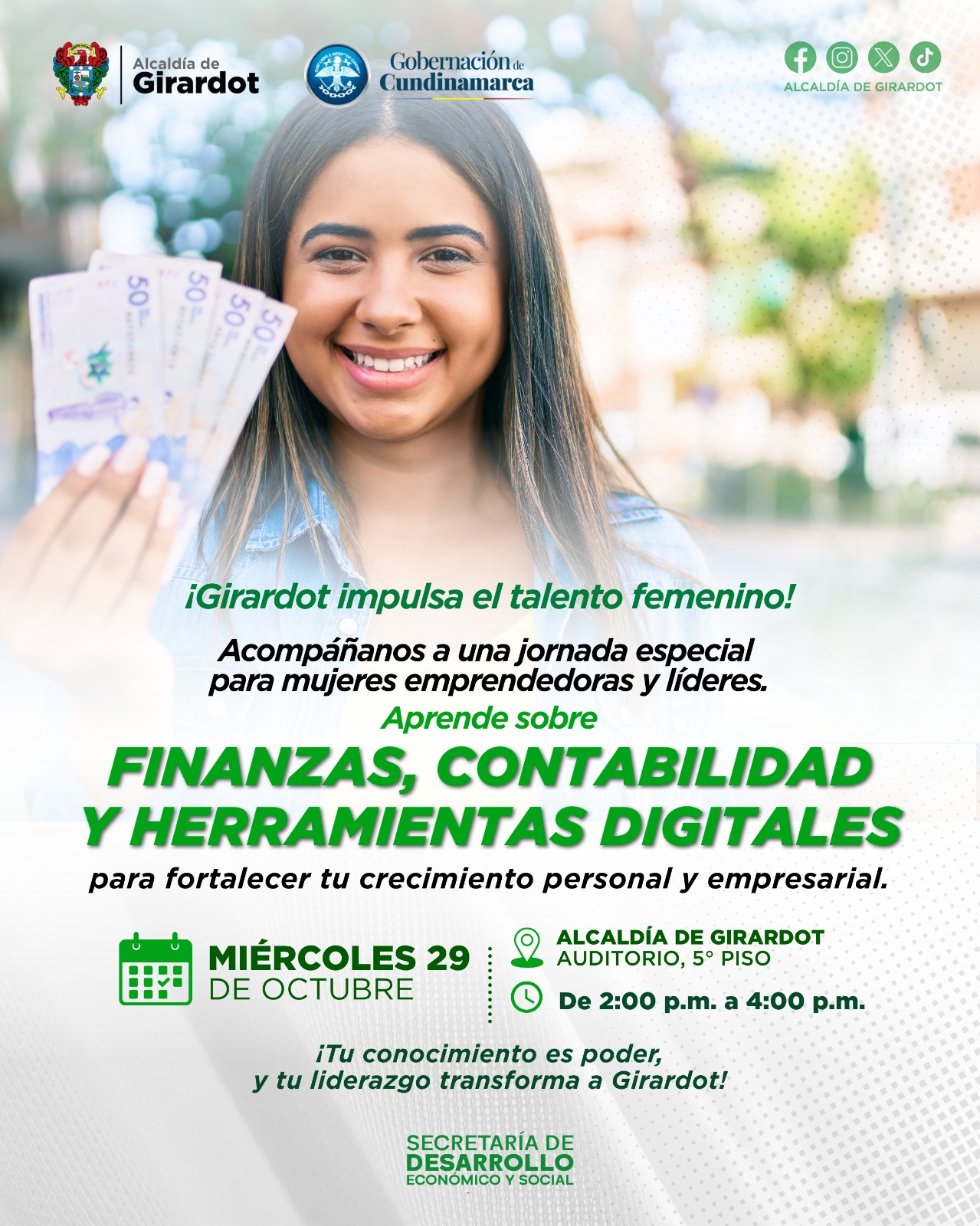 El Programa #DesaecoMujerYEquidadDeGénero, en articulación con la Gobernación de Cundinamarca, invita a todas las emprendedoras y líderes de Girardot a participar en una jornada de formación en finanzas básicas y herramientas digitales, diseñada para fortalecer sus proyectos y potenciar su autonomía económica. 💪💻